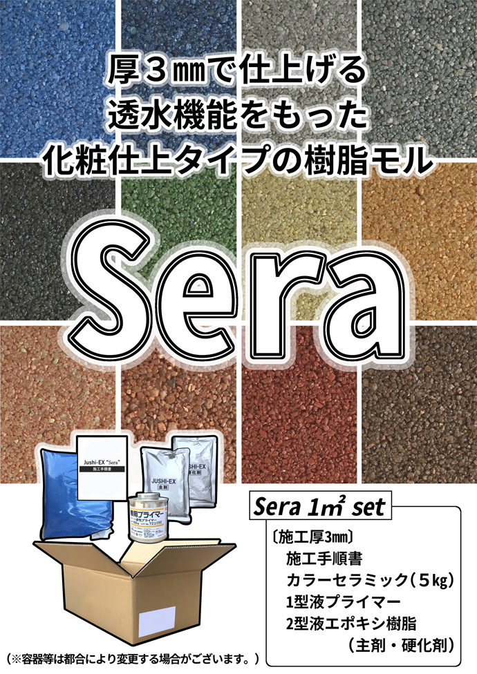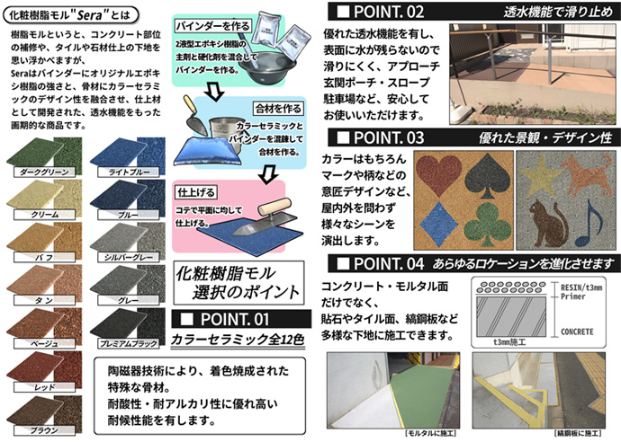 "Sera"はバインダーにオリジナルエポキシ樹脂の強さと、骨材にカラーセラミックのデザイン性を