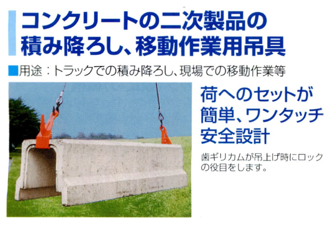 コンクリート二次製品の積み降ろし、移動作業用吊り具。荷へのセットが簡単、ワンタッチ安全設計