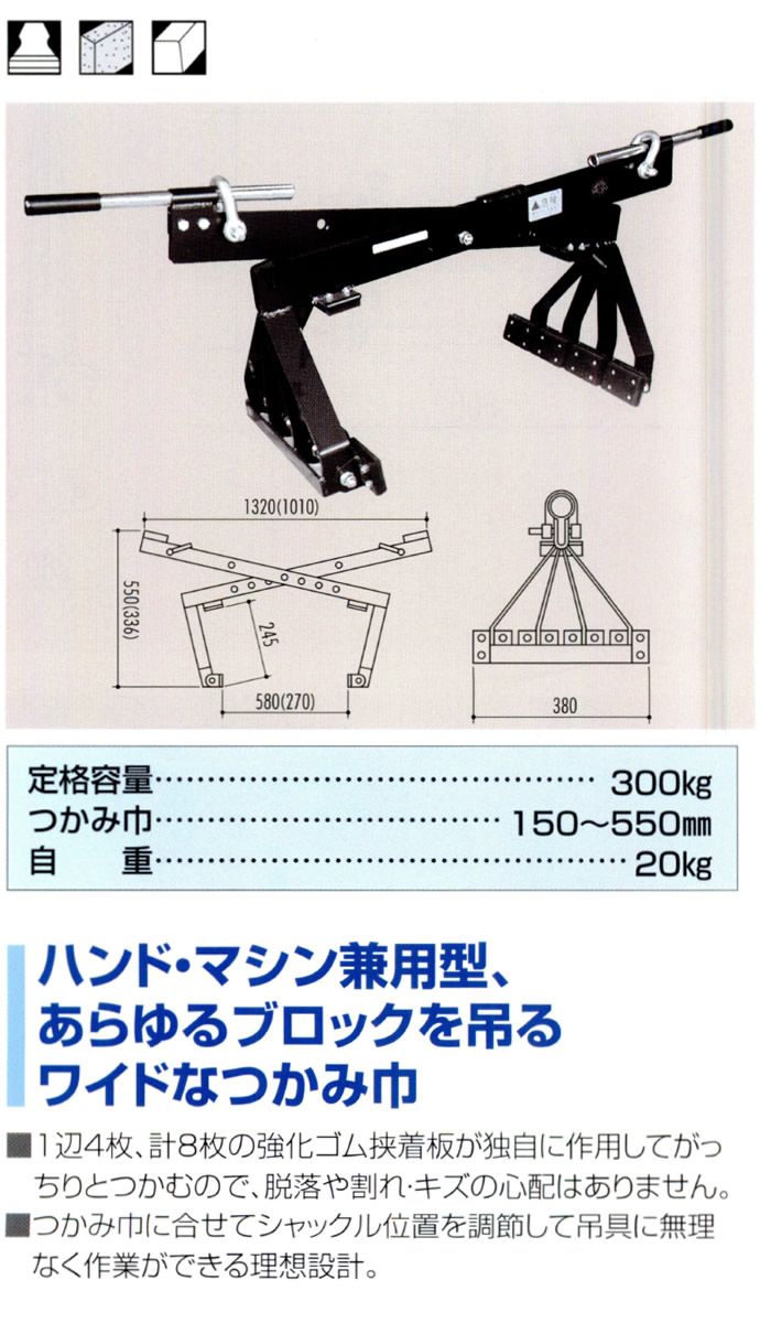 ハンド・マシン兼用型あらゆるブロックを吊るワイドなつかみ巾荷に傷をつけないゴムパット仕様 1辺4枚、計8枚の強化ゴム狭着板が独自に作用してがっちりとつかむので、脱落や割れ・キズの心配は有りません