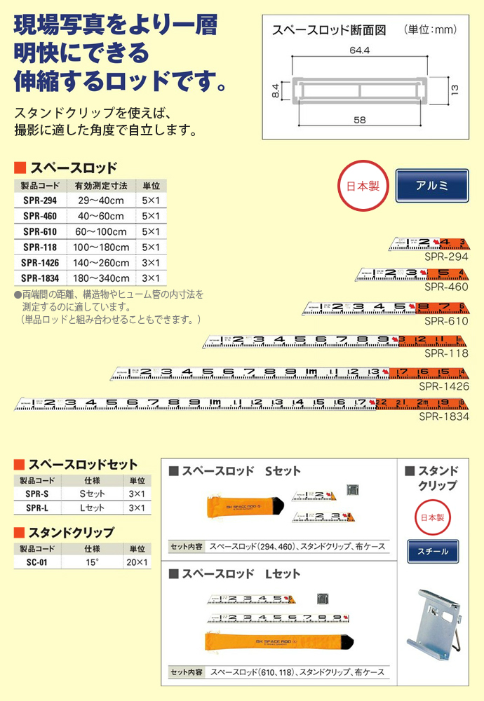 両端間の距離、構造物やヒューム管の内寸法を測定するのに適しています。(単品ロッドと組み合わせることもできます。)