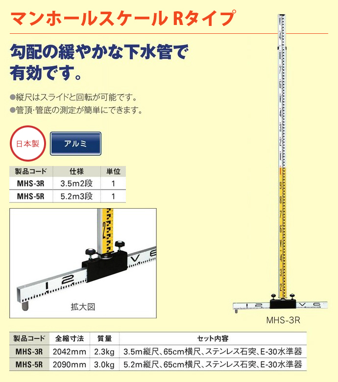 セット内容:5.2m縦尺、65cm横尺、ステンレス石突、E-30水準器