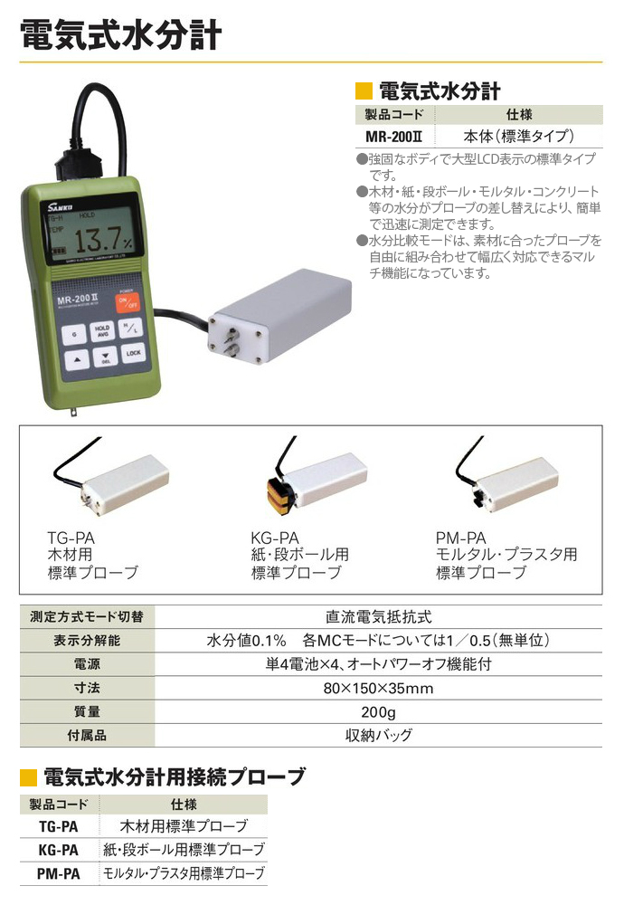 木材・紙・段ボール・モルタル・コンクリート等の水分がプローブの差し替えにより、簡単で迅速に測定できます。