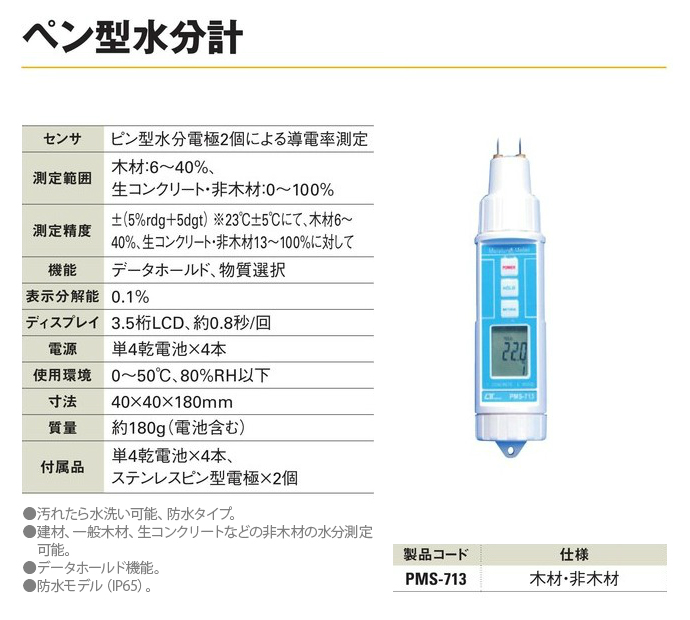 建材、一般木材、生コンクリートなどの非木材の水分測定可能。