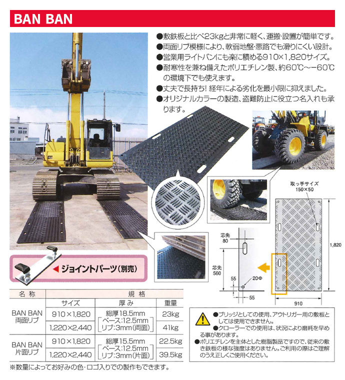 ●ポリエチレンを主体とした樹脂製品ですので、従来の敷き鉄板の様な強度はありません。ご利用の際はご理解のうえ正しくご使用ください。